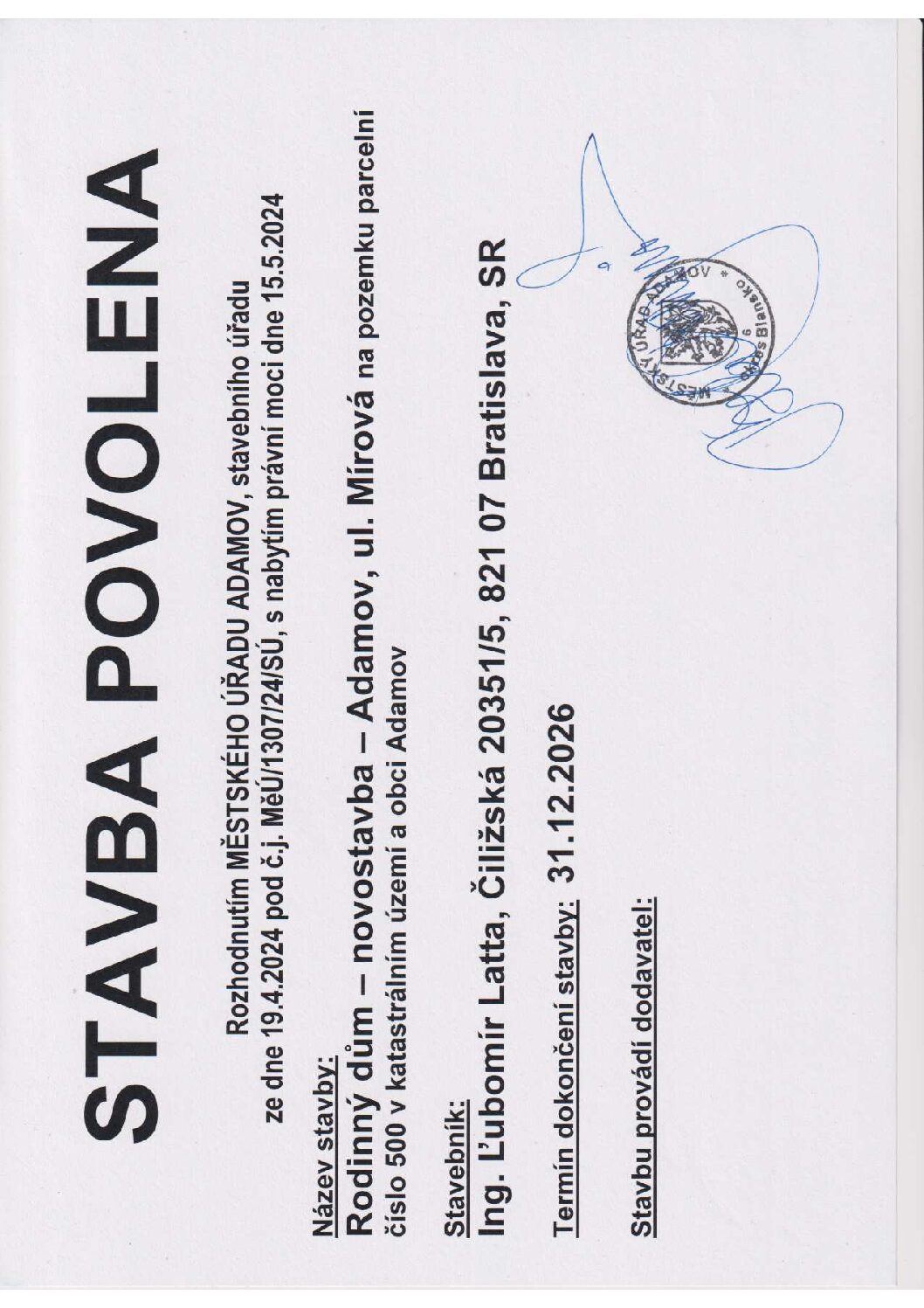 Nabízíme ke koupi stavební pozemek v Adamově o rozloze 890 m² s platným stavebním povolením na moderní dřevostavbu. Stavební povolení je vydáno až do konce roku 2026 a součástí stavebního povolení je i vrt pro vodu, povolení se dá prodloužit. Svahovitý terén nabízí krásné možnosti pro architektonicky zajímavé zasazení stavby do okolní krajiny, která poskytne budoucím majitelům blízkost přírody a výhledy. Projekt počítá s užitnou plochou rodinného domu o výměře 118 m² a dispozicí 5+kk, dále se zahradním skladem o velikosti 19 m². Všechny potřebné podklady a dokumentace k projektu jsou k dispozici u makléře. Tento pozemek nabízí výjimečnou příležitost začít stavět bez zdlouhavého vyřizování povolení a vytvořit si domov s duší uprostřed přírody, s pohodlím dostupnosti města na dosah ruky.